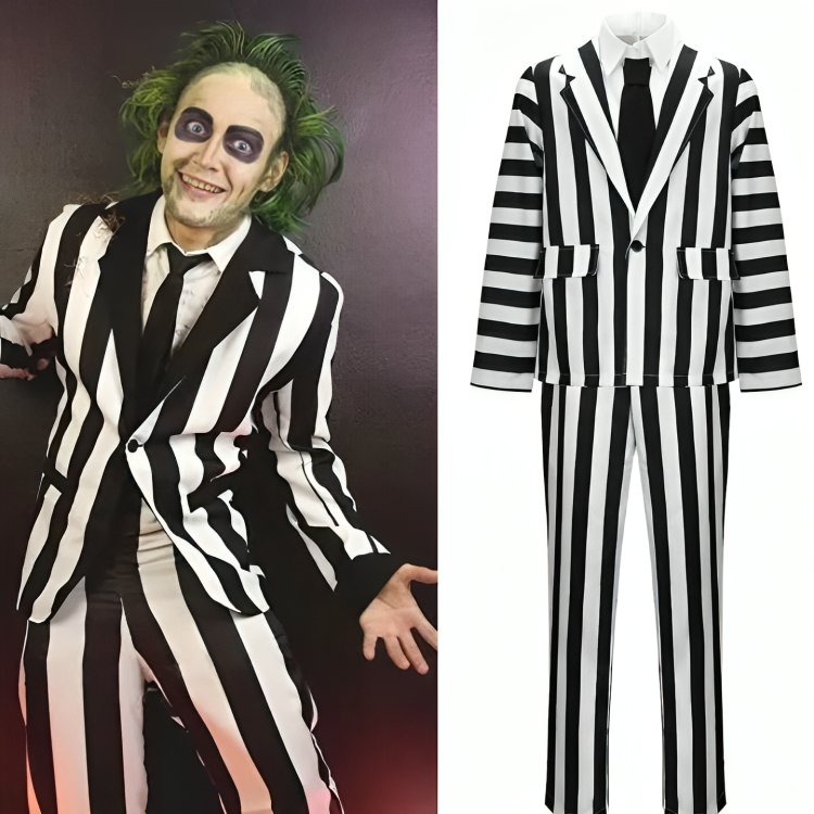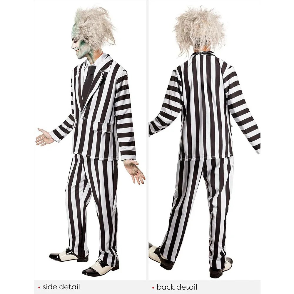 - Terno listrado preto e branco: Fiel ao filme, o icônico terno de Beetlejuice é o destaque da fantasia. Feito com tecido leve e de qualidade, ele proporciona conforto durante toda a festa.